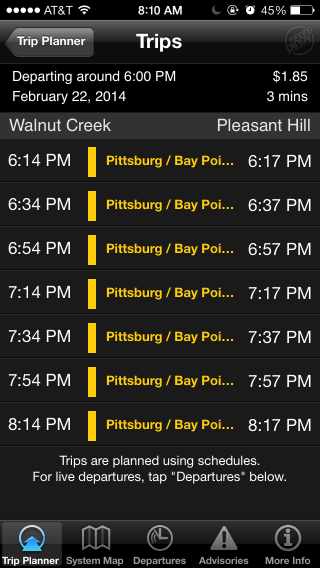 I could not imagine myself getting into places without BART (Bay Area Rapid Transit). Sure it’s very expensive (minimum of $1.85 or about ₱80) if you compare it similar trains in Metro Manila (₱20 maximum for the entire line or less than half a dollar), but it’s very cheap if you compare it with taking a cab (around $2 for a 2 mile ride) and it takes you in a lot of places very quickly and conveniently. According to BART’s website, the trains run at a maximum of 80 mph (miles per hour; around 129 km/h) and average of 33 mph (53 km/h) so it’s much faster than any train in Metro Manila! Putting that into local perspective, its average speed is just below the maximum speed limit in Commonwealth Ave. (60 km/h) and its maximum speed is beyond the speed limit on the SkyWay!