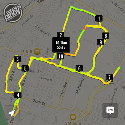 The 10K route was surprisingly more challenging than I had expected. I probably had gotten used to the flat terrain of SM Mall of Asia area (where major races are usually held) that I had forgotten how hilly Bonifacio Global City is. Anyway, as much as it was a bit bothersome, I was anxious to catch up with my officemates so I didn’t pay much attention to it. I was cautious though that I don’t run in a pace that’s no longer “fun.” I wasn’t there to set a new personal best to begin with but a sub-60 10K would be nice.